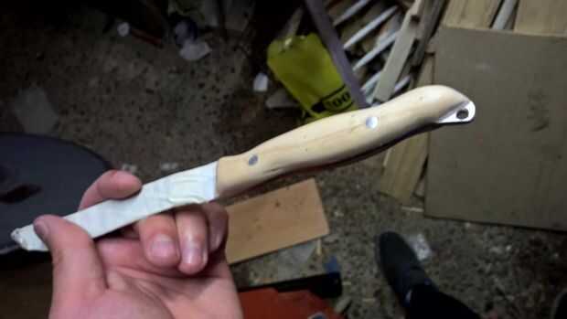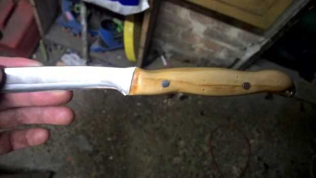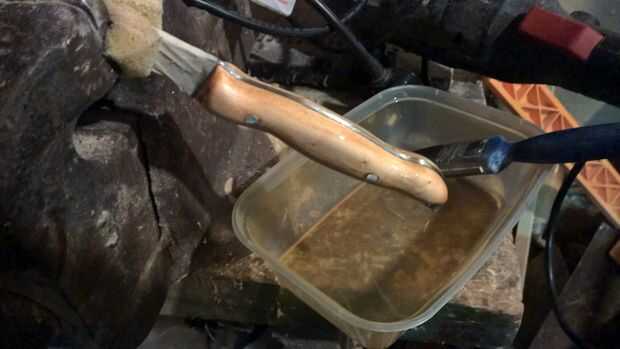 Volver cada 10-15 minutos y repita el proceso anterior de enjabonarse el mango de madera en aceite, trabaja el aceite en la madera y luego enjabonarse otra vez en aceite - hacer esto en cualquier lugar de 5 - 15 veces hasta que la madera se ve como si no puede absorber más aceite. En este punto, coloque el cuchillo en el vicio por la cuchilla, coloque la tina debajo de la manija de modo que cualquier exceso de aceite puede escurr en él y cubrir el mango una vez más. Dejar media hora a 45 minutos hasta que el aceite comience a espesar e ir un poco 'cutre', en este punto necesitará limpiar este aceite pegajoso con un trapo y luego dejar la manija completamente seco durante 24 horas.
