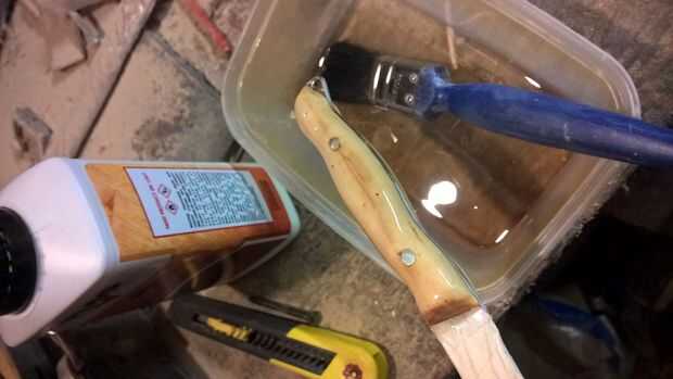 Envuelva su navaja en una especie de cinta que puede sostener el cuchillo por la hoja sin cortar su mano abierta. Luego coloque el cuchillo, manejar en primer lugar, en la tina de aceite y sofoque generosamente el aceite en la madera. Pruebe y utilice el cepillo para frotar el aceite en la madera antes de sofocación con aún más aceite y repetir. Hacer esto unos 5 o 6 veces, cuidado de cubrir la madera entera uniformemente la superficie y luego dejar sentado en el aceite durante 10 minutos o menos.