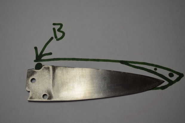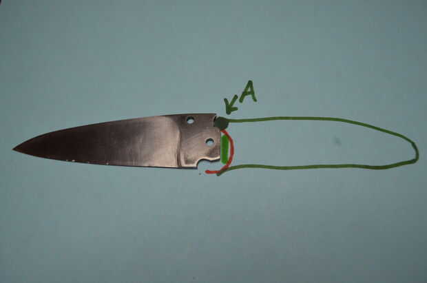 Imagen 1 (hoja abierta): punto A es donde el perno de parada con la cuchilla. Limando el metal sobre la lámina que entra en contacto con el perno de parada (punto verde), la cuchilla debe girar más atrás, y así se levantará la punta de la hoja. Cuando presentas este uno, tratar de alinear el cuchillo como diseñaste. Una espina dorsal recta ayuda a la alineación, pero no es necesaria en el diseño.