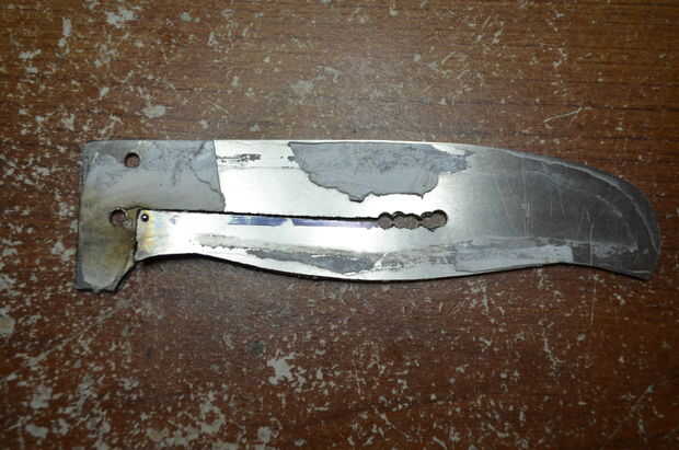 Antes de empezar, armar el cuchillo y abrir la hoja. Marca Dónde está la espiga de la hoja. Que desea recortar la barra con aproximadamente 1 mm solape con la cuchilla. Si no hay ninguna coincidencia, la cerradura se abrirá demasiado lejos sin la posibilidad de ajustar y el cuchillo se arruinará. No olvide tener en cuenta el espesor de la Sierra!