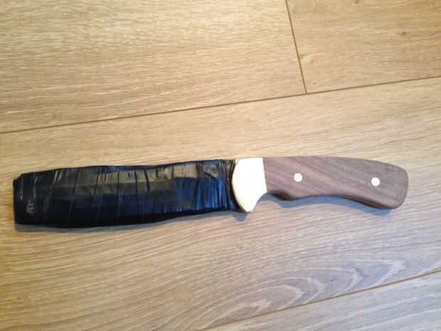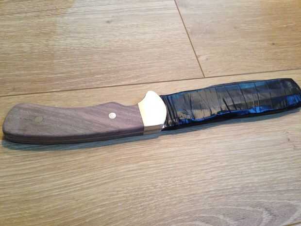 Mantenga quitar material y formar el mango al gusto. Al empezar a acercarse al nivel de la virola de latón y mango de acero, cambiar una pieza gruesa de papel de lija. Esto ayudará a asegurarse de que obtener una agradable transición incluso entre el bronce y la madera. Se ha añadido un radio pequeño en el borde de la madera para que coincida con el mismo radio que estaba en los refuerzos de latón. Esto crea continuidad entre los distintos componentes de la hoja.