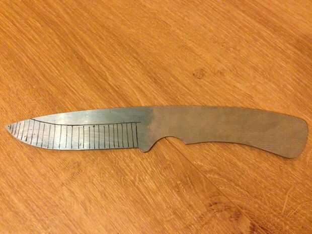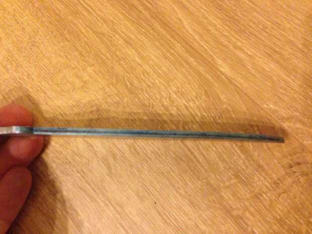 El bisel es la sección de la hoja donde el perfil se adelgaza hacia abajo hacia el borde de corte. Como se muestra en la imagen, trace una línea por la mitad del acero donde desea que el borde de la hoja a ser. Sujete la hoja horizontalmente en una tabla y utilizar el archivo para moler poco a poco el borde para agregar el perfil de chaflán. Muchas personas optan por hacer este detalle usando lijadoras etc. pero solo tuve acceso a un archivo, funciona muy bien pero lleva un tiempo! Como presentar a lo largo del borde de la hoja, intente mantener el mismo ángulo entre el acero y el archivo. Seguir presentando en este ángulo agudo hasta llegar cerca de la línea para el borde. Es clave que usted no presentar más allá de esta línea de lo contrario su hoja tendrá una inmersión en el perfil!!!! Siempre puede sacar más material, pero no se puede Agregar en así que asegúrate de que tome su tiempo y hacerlo con cuidado! Una vez que han presentado un lado, voltee la hoja y repita del otro lado. A mano, esta parte lleva un par de horas por cada lado.