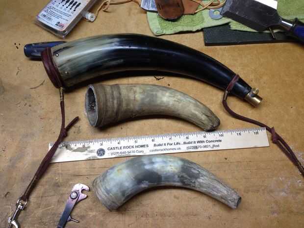 OK, así que hice una bolsa de bolsa/posibles cazadores y tuve este cuerno de polvo que era muy bonita pero demasiado largo, y no estaba contento con la caída de polvo o tapa final. También tuve un par de cuernos de buey real resistida y se encuentran en el cuadro como una comparación de tamaño. lo que quiero es un cuerno no más que cerca de 9 pulgadas de largo.