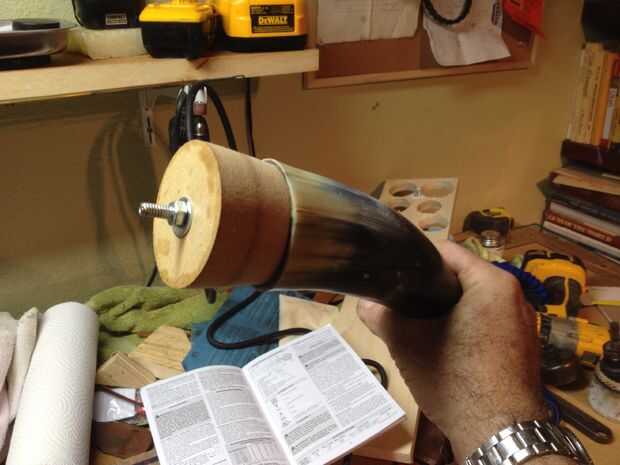 Cuernos de vaca no son naturalmente redondeadas en la base, son más gruesas en algunos puntos que otros y tienen algunos cantos en el interior. cortar la Plaza final, utilicé una sierra de banda, pero se puede utilizar una sierra para metales. Coloque una hoja de papel de lija de 150 en una superficie plana lisa y trabajar el extremo del cuerno en él para eliminar las irregularidades.