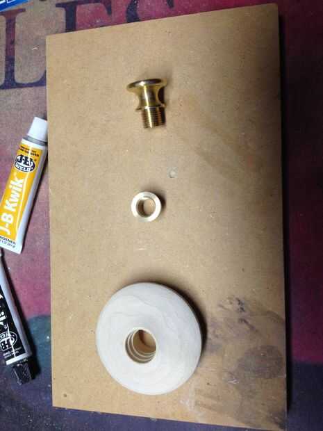 He utilizado un taladro de escalones de ambos lados del enchufe hasta que el buje en la primera foto encajaría perfectamente en el orificio central. puedes ver el paso graduado dentro del agujero en la foto. Yo continué hasta que el latón Casquillo ajuste al ras.