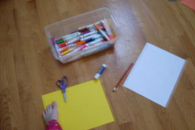 Materiales: Tijeras 1 hoja de blanco escribiendo papel 1 hoja de cartulina color Marcadores, u otra cosa con que puede teñirse Lápiz Palillo del pegamento