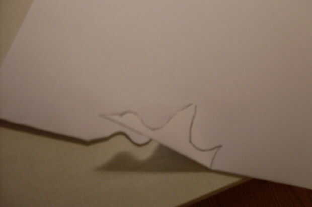 Ahora desde el lugar donde el pico de las aves con el doblez en el papel, cortar a lo largo de la forma de pájaro que acaba de hacer, hasta el lugar en el ala fueron dejado de dibujo.