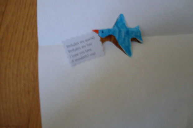 Está casi terminado! En WordPad y tipo un mensaje corto pero dulce, un poema corto sería perfecto. Luego debe cambiar el tamaño a 12 o 14 y escoge una linda fuente. A continuación, imprimir hacia fuera, recórtalo y pega pega en el interior del pico de las aves.