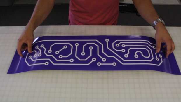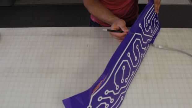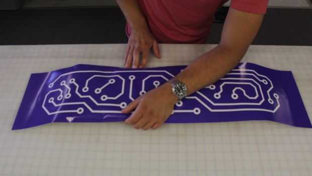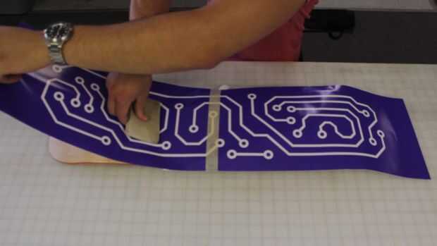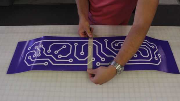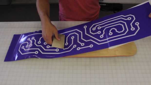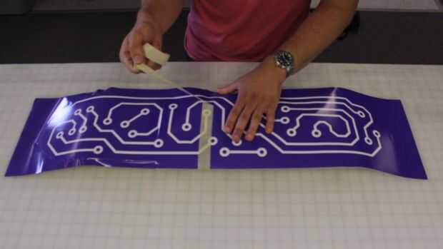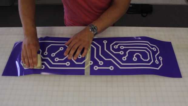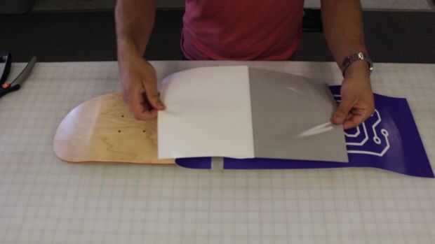 Colocar el vinilo sobre el tablero y ajustar su diseño por sentimiento hacia fuera de los bordes en los lados izquierdo y derecho. A continuación, parte superior e inferior, asegurándose de que el diseño es en el lugar correcto. Asegure el vinilo con un trozo de cinta adhesiva por la mitad.