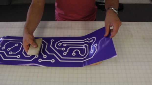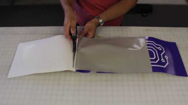 Tire hacia atrás un lado de vinilo asegurándose de que no arrugue. Retire el papel y cortar con unas tijeras. Tire el vinilo enseñó y la escobilla de goma hacia abajo en el centro, hacia el final. Luego, a partir de la media mudanza, escobilla de goma los bordes superior e inferior.