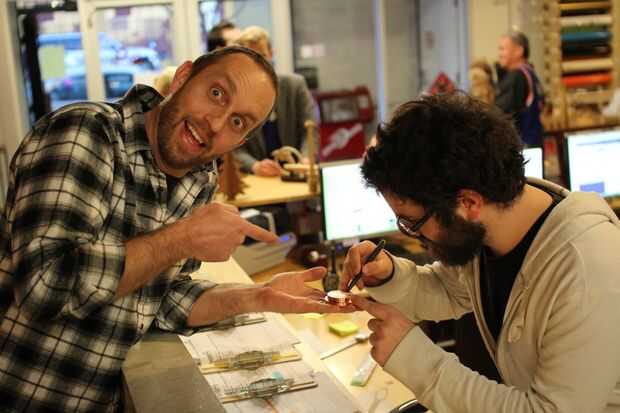 Haber terminado (o eso pensaba) la parte superior de la matriz me lo quitaron de la tirada, la volcó y pasado un tiempo cluelessly mirarlo.  La idea aquí es cortar una ranura en la forma de una S por la parte inferior de la matriz para que alinee con los agujeros de 3/8" perforé en el otro lado.  Después murmurando para mí durante un tiempo tomé mi pedazo de cobre hacia fuera a la recepción consultar a los chicos con barba.  No es que difícil decir cuál de estos dos era más provechoso :)