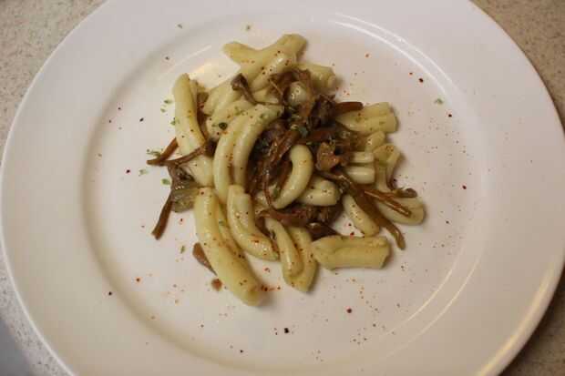 Cortar la pasta alrededor de 1,5"- 2" de largo, mezclar con la harina, hervir para tal vez 7 minutos hasta que se hace. Mientras la pasta se cocina tirar algunos restos salteado de setas (en este caso yellowfoot rebozuelos que buscaban para la semana pasada) en una sartén con un poco de mantequilla, agregar algunos parm recién rallado, escurrir la pasta, echarlo en la sartén con las setas, ajustar la sazón y servir con un poco d ' Espelette orégano y piment en la parte superior.