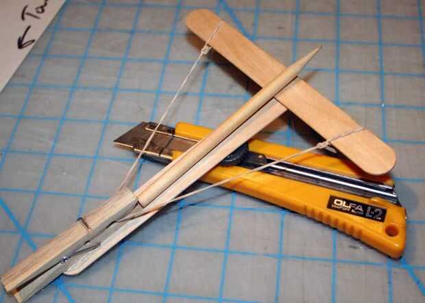 1) caliente unir las dos lengüetas en forma de T. 2) la pieza superior en dos lugares cerca de cada borde de la muesca 3) romper una goma y atar dos nudos en cada una de las muescas 4) hotglue una pinza en la parte posterior de la T 5) prueba tu ballesta