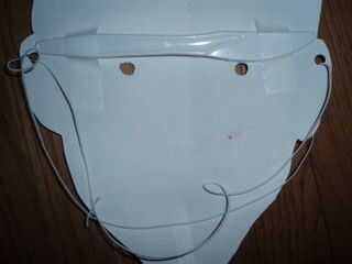 Obtener un objeto rígido (una pieza de cubiertos de plástico es perfecta) y cinta adhesiva en el interior de la máscara sólo por encima de los ojos. Esto evitará que la máscara de envolver alrededor de su cara demasiado.