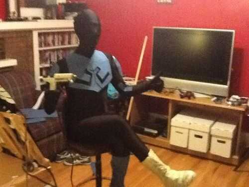Para los hombros, corte dos círculos de espuma azul. Utilice una pistola de calor o un secador de mano y estira la espuma sobre algo curvado, como un cuenco o una bola para darle una forma curva. Una vez hecho esto, coloque la almohadilla de calor dentro de su traje de zenta y pegarlos en el lugar.