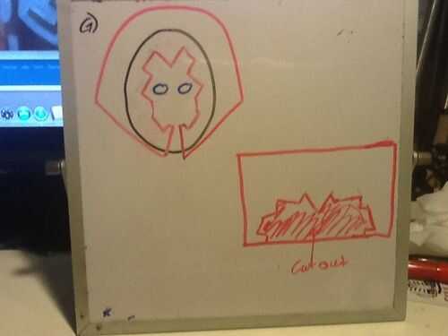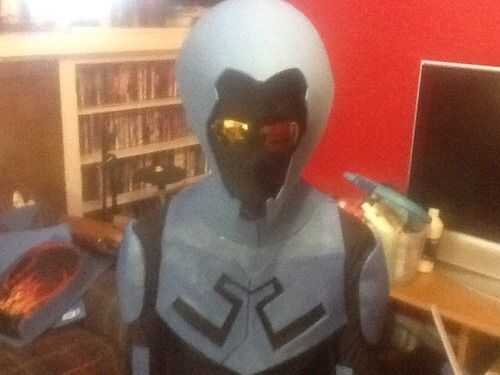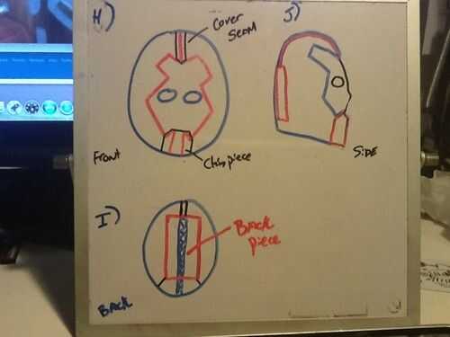 La máscara era la parte más complicada del traje. Tomé algunos tiza y había delineado de ojos de la persona así que sabía donde estaba su colocación. Esto es complicado, pero caída allí. He usado una pistola de calor / sople secador para ayudar a formar la espuma. Tenga cuidado si usa una pistola de calor, ya que se calienta realmente realmente. Toma una hoja de espuma azul y dóblela alrededor de la cara. Incluso sería mejor doblar la espuma en medio y cortar el contorno primero antes de ser colocado en la cabeza... Pero pega sólo la parte delantera de la cara pulg (foto G)