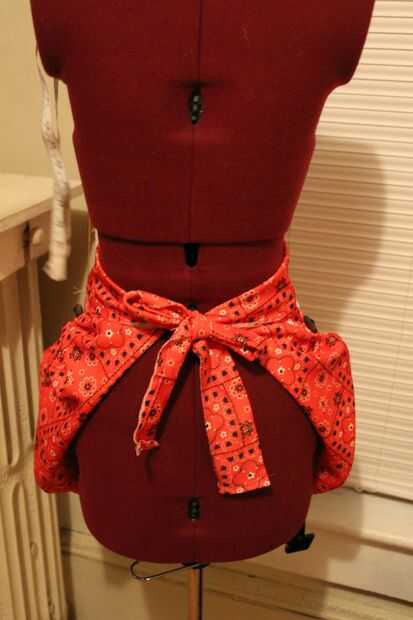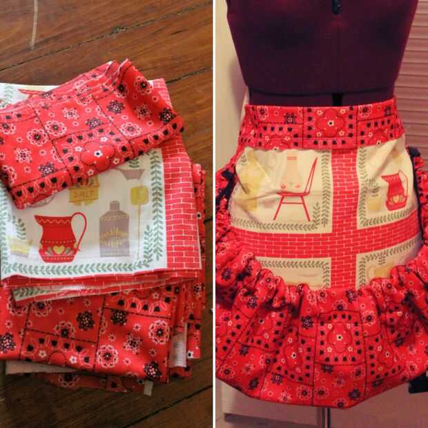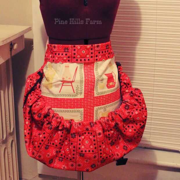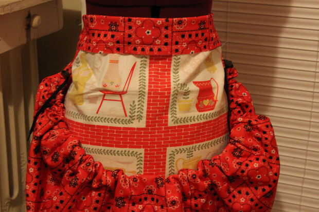 Tejido roja delantal-Vintage y un viejo paño de tabla de 1950 que era de mi abuela. El mantel había visto días mejores para reciclado en este delantal. Coloqué las cuerdas de tracción en los lados.