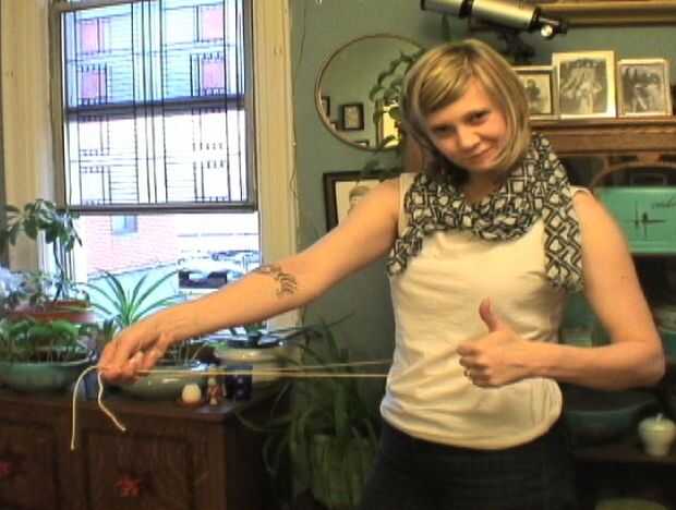 Colocar un pasador en el extremo de la cuerda y pasarlo a través de la cubierta superior de su delantal. Una vez que se tira a través de todo el camino, atar nudos más grandes en cada lado para que no resbale a través.