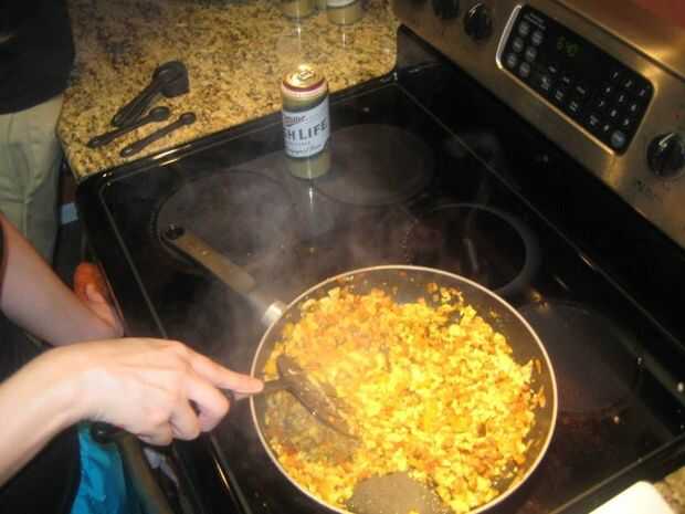 a continuación, las verduras que se cocinarán más rápido pueden introducirse a la rebatiña. Añadir las setas, cebollas y tomates. Revolver.