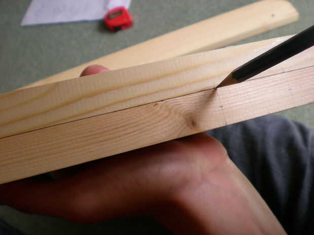 1. medir 85 mm desde el extremo afilado a lo largo del borde superior y márquela. (85mm desde el extremo original de la tabla: en la retrospección esto hubiera sido más fácil antes disminuyendo al final).