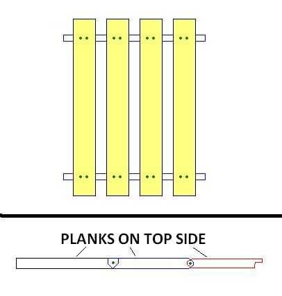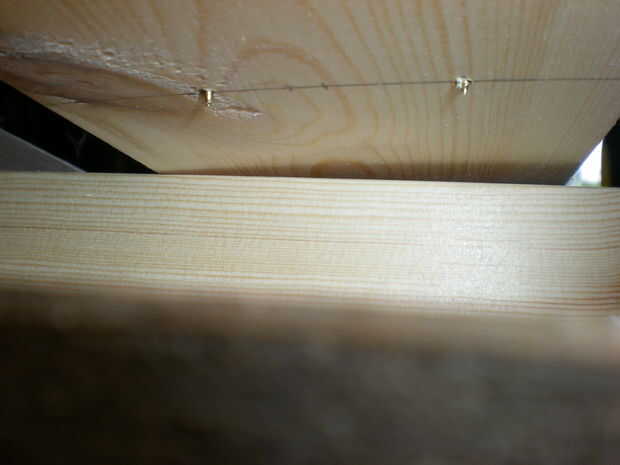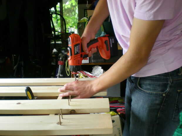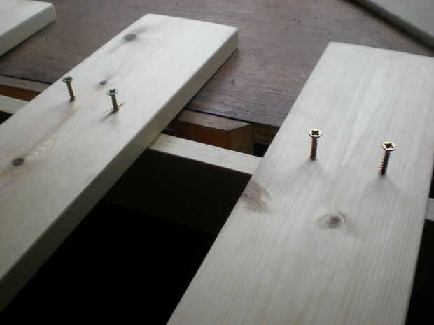 Los 4 tablones largos medidos anteriormente fije para las tablas cortas medianas (700 x 70 mm) 7 planchas a las otras tablas (lo 770 mm x 70 mm y el 690 mm x 70 mm) y el tablón agujeros solo va en el 770 mm x 70 mm). Debería ser bastante obvio pero es importante hacer en el lugar correcto para que el futón se dobla correctamente.