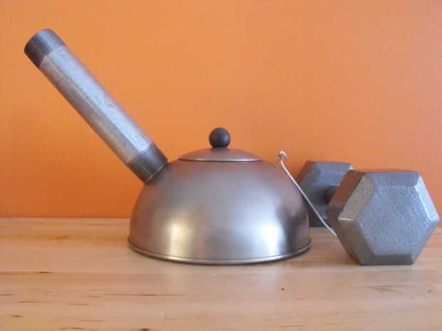 Sacan de la parte del silbido de la tetera, (deben ser algunos tornillos que la sujetan en su lugar) y poner el trozo de tubo sobre el cuello de la tetera. (Un mazo de ayuda en este paso). Usted debe ser capaz de quitar el tubo con un poco de tirón.