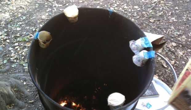 1. siempre comenzar un fuego en un recipiente (el cañón de acero de 55 galones o un hoyo de barbacoa)