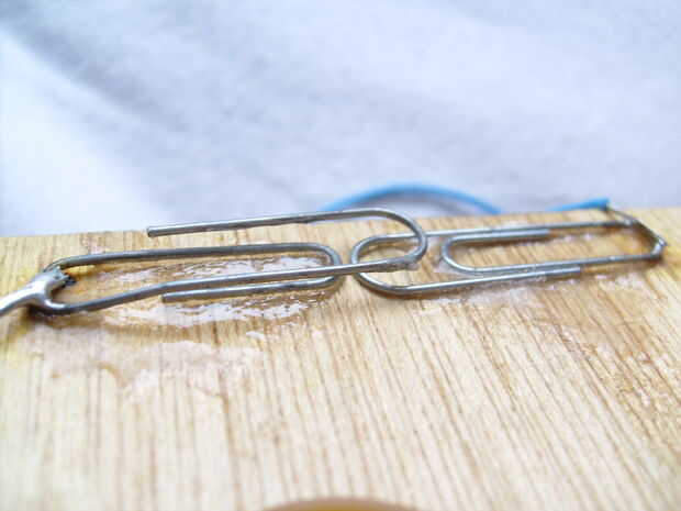 mezclar los dos araldites juntas para hacer un pegamento araldite. extensión en la parte posterior de la nd de tablero de madera en el clip sin doblado en primera. colocarla en el clip de papel doblado la punta superior de la misma está sobre el clip sin doblado pero no deben tocar.