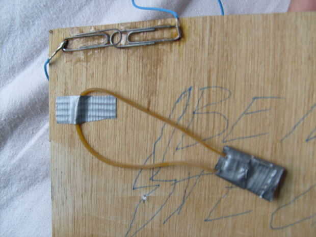 pegar en la venda de elástico o cadena y la banda elástica o cuerda en la parte trasera de la tabla de madera del palillo.