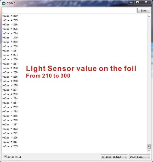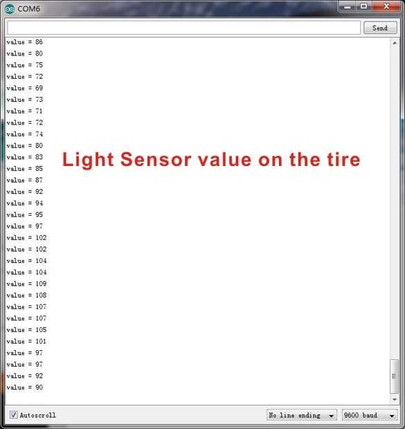 Primero usé el código de ejemplo de Makeblock Me-LightSensor para probar la diferencia entre el neumático y el papel de aluminio.