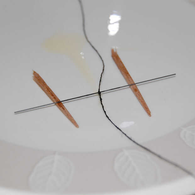 Cuidadosamente Deslice un trozo de grafito a través del bucle del nudo y coloque el hilo y el grafito sobre una placa. Usé dos mitades de un palillo de dientes para mantener el grafito suspendido encima de la placa. Esto ayuda a mantener el aceite confinado a un solo punto en el grafito.