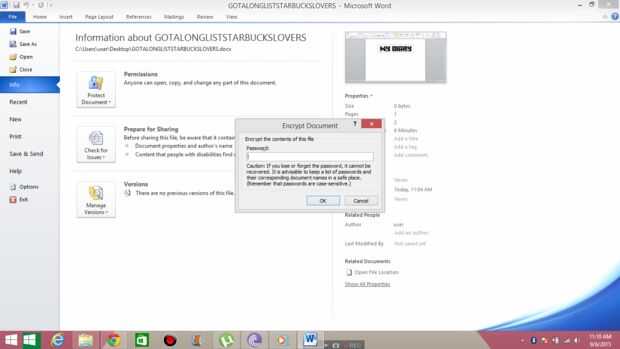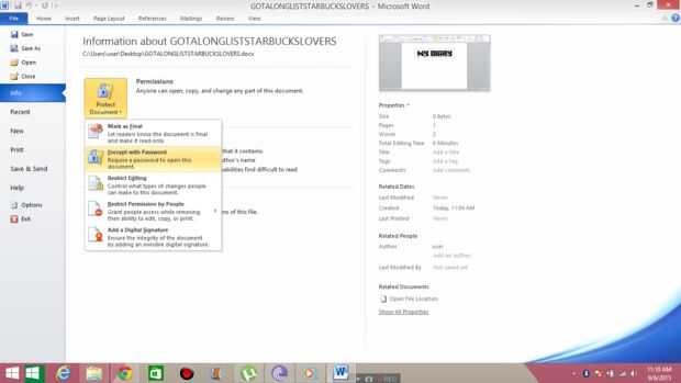 OK, vamos a poner una contraseña. ¿Qué debemos poner? 123 no porque todo el mundo lo sabe. Así que ahora, vaya a "Archivos", luego ir Pulse "Proteger documento" y presione "Cifrar contraseña", luego vamos al siguiente paso.