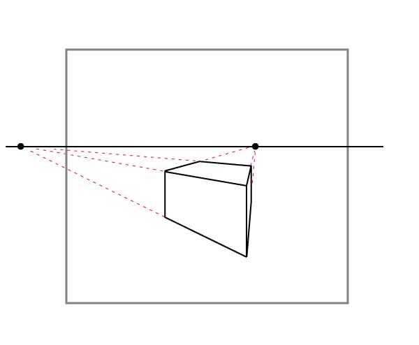 Aviso de la foto de arriba, uno de los puntos de fuga está fuera del marco de imagen. Más dibujos de la perspectiva de dos puntos tienen al menos un punto de fuga fuera del marco de imagen, y algunos tienen ambos puntos de fuga fuera del marco.