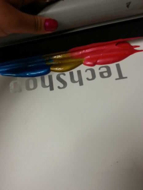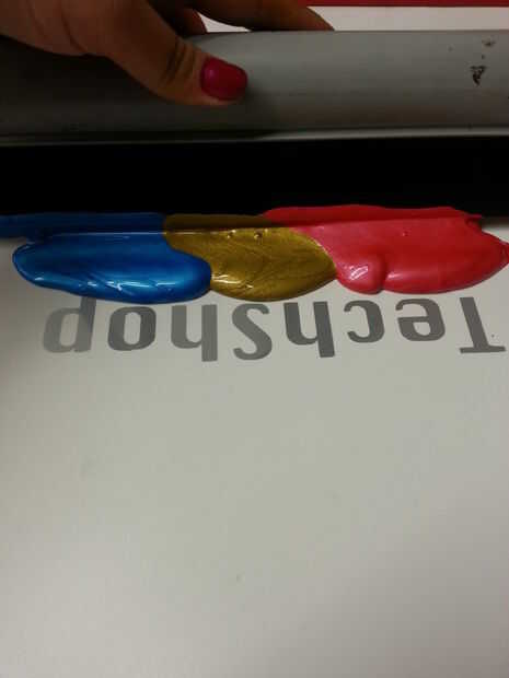 Queremos un agradable aspecto mezclado, por lo que necesitamos para asegurarse de que los colores se superponen. La escobilla de goma, pegan en sus globos de pintura y un movimiento de lado a lado zig-zag. Si no desea demasiada mezcla, lo suficiente para asegurarse de que haya ningún espacio en sus colores.