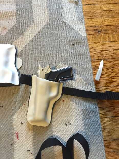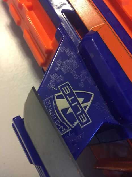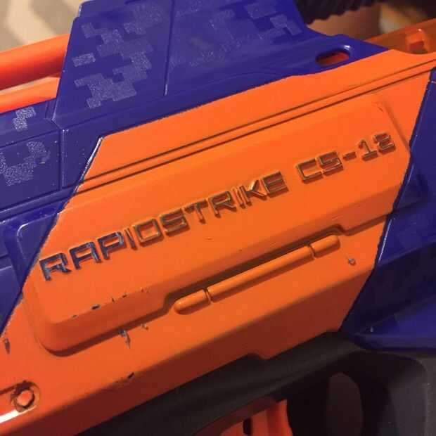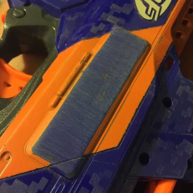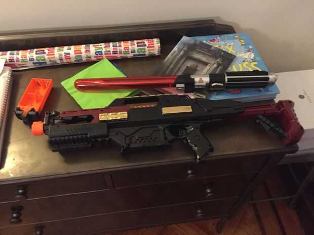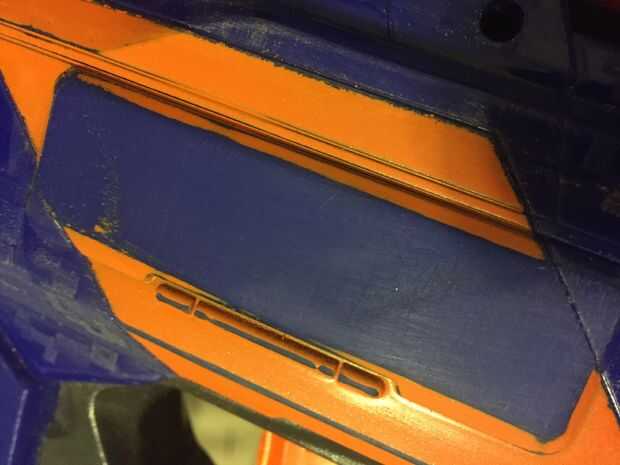 Para la pistola de grande empecé con una nerf rapidstrike que lijar los logotipos de y pintado con pintura en aerosol negra, roja y oro mi y cinta adhesiva para obtener el diseño.