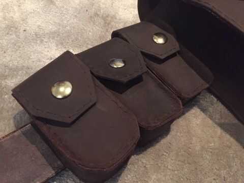 Tres de estas bolsas necesita para el conjunto, cada bolsita se compone de 4 piezas; una conexión de 2.5x21.5cm de la tira, una ficha para conectar a la banda, un pedazo de delantero más pequeño (pieza A) y un pedazo más grande que forma la parte trasera y la tapa (pieza B). Puede Aplique sellador a la parte posterior de la ficha y animal doméstico por voluntad de una superficie dura para dejar las fibras del cuero de ir por todas partes permitiendo que el cinturón de ranura en la más fácil, pero es opcional, es más fácil hacerlo antes de cortar el la ficha.