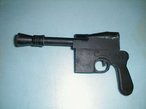 Para hacer la pistola primero corte el contorno de la forma del arma de la pieza de madera de 1 x 6. Luego tallar las zonas relevadas alrededor del gatillo y empuñadura con una dremel. Ahora hacer la pistola de cañón de un taco de madera y pegamento en la parte superior del cuerpo de la pistola. Ahora cortar dos piezas de 1/8" madera prensada y pegar a cada lado del cañón en la parte superior del cuerpo de la pistola. El PVC de acoplamiento en el extremo del barril del arma del pegamento y pegar una sección de corte de un embudo en el otro extremo del acoplador.