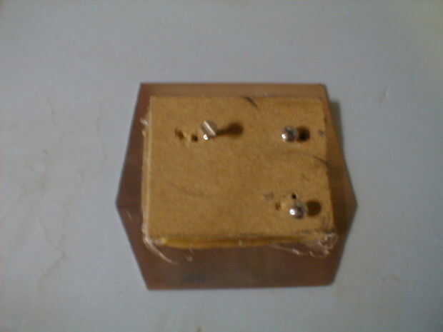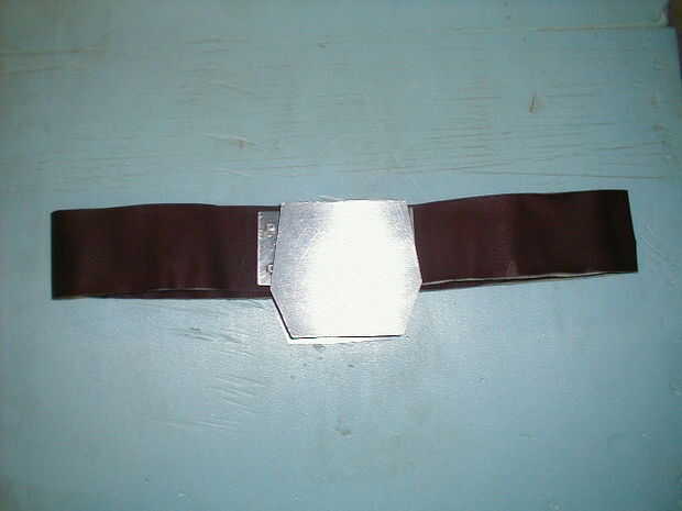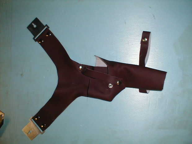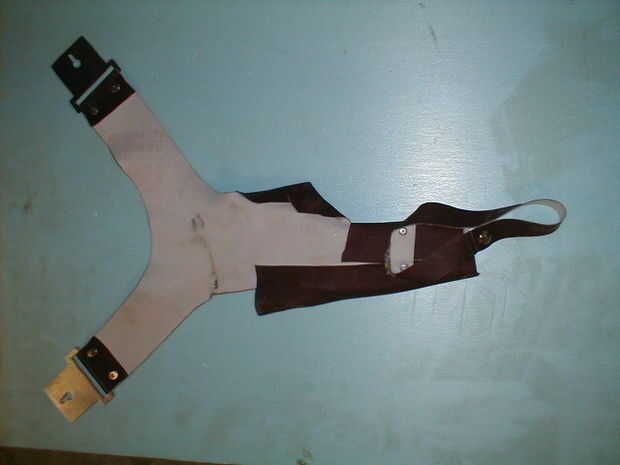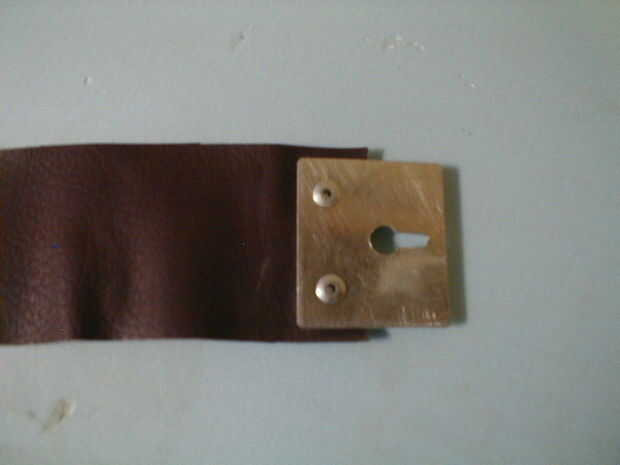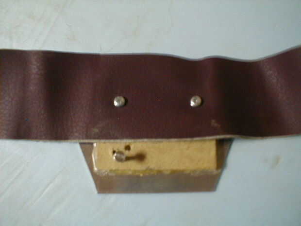 Hacer la cinta de vinilo. Ahora hacer que los extremos de la correa (tres de ellas) de hoja de aluminio fina como se muestra. Están diseñados para deslizarse sobre los tornillos. Estos conseguirán remachados en los extremos de la correa y funda.