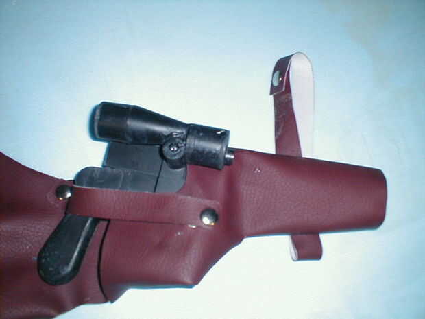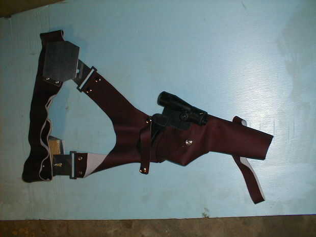 Para hacer la funda establecer el blaster y cortar el vinilo alrededor de él para obtener la forma derecha y luego lo pegue con la pistola de pegamento caliente. Ahora del remache en los extremos de la banda. Hacer una correa para la pierna y una correa de la funda de vinilo y encaje en ellos.