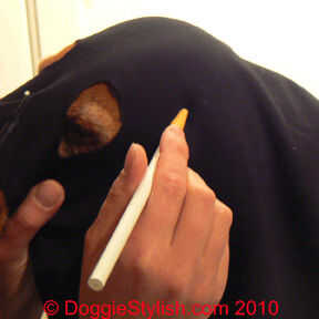 Coloque la mascarilla en la cara de su perro y marque donde están las orejas. Corte los orificios de tamaño generoso