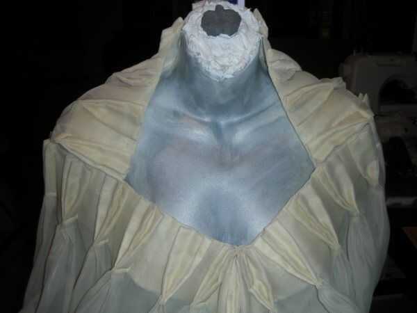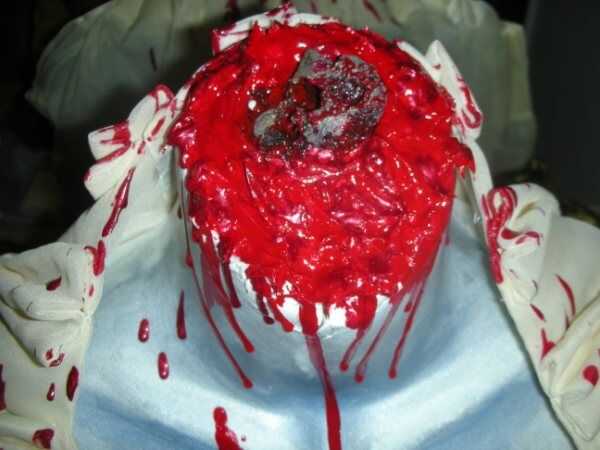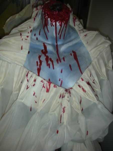 Cuando la pintura y la silicona se seca utilicé el esmalte de uñas para crear la sangre. Nunca me di cuenta de cuánto esmalte huele hasta que había vaciado 2 botellas llenas. Asegúrese de que usted está en un área bien ventilada. Hacerlo fuera si puedes. Para mi sorpresa el pulimento de clavo comenzó a corroer la espuma de poliestireno que había goteado en el y el efecto fue impresionante! Tenía una botella de rojo mate y uno que era un poco trémulo que trabajó fuera realmente bien. En el momento no pude decidir que uno miraba la más realista, así que compré dos. Goteó el esmalte de uñas el cuello y vestido. La consistencia más gruesa creado un patrón de goteo de gran. La textura de silicona 3D hace que sea aún más realista.
