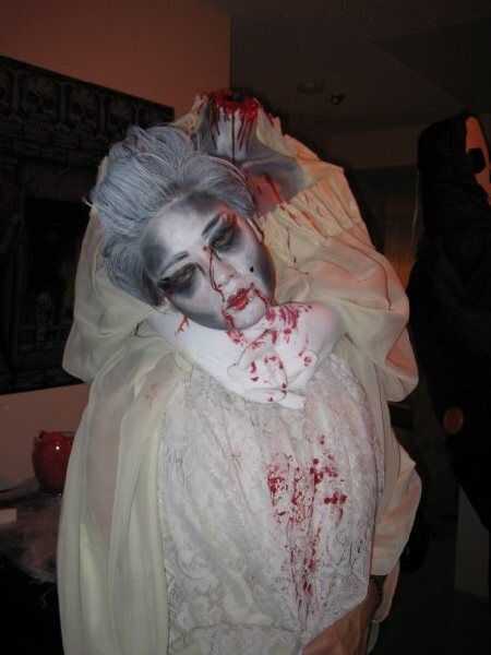 Aunque el traje es increíble, es también el maquillaje, pelo y juegos de rol que realmente viene vivo... o muerto... vivo o muerto? de todas formas, compré blanco spray para el cabello desde el almacén del dólar (me puedes decir < 3 el almacén del dólar?), cubrió mi cabello después de usar rodillos calientes y enormes cantidades de spray de pelo y se lo blanco. He aplicado hacer crema blanca encima de mi cuello y hombros (no olvides las orejas) y sombra mis sienes, debajo de mis ojos y los huecos de mis mejillas en mi mandíbula. Utilizado sangre falsa para hacer Cupido arco labios. Luego inclinar mi cabeza hacia el lado y usando una punta de Q, goteó sangre así que funcionó desde los bordes interiores de los ojos y los bordes de mis labios a gotas correspondientes en los guantes. Ya tengo contactos gris y ayudó el efecto así. Llena mis ojos de negro realizando los bordes como latigazos de monstruo. El último toque fue el topo! Guardé en carácter a través de la noche y tienen un montón de fotos de mí pretendiendo muerden gente. Tuve una explosión! Esperamos que hayan disfrutado mi primer Instructable. Ciertamente tuve un buen rato haciéndolo! :)