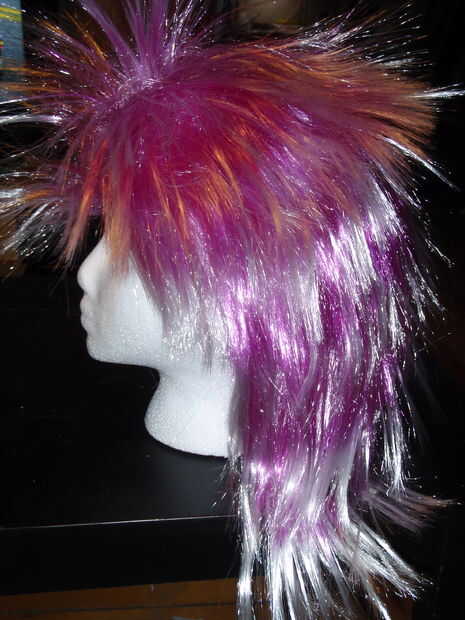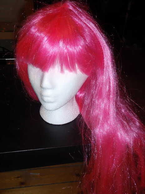 compré una peluca rosa larga con flequillo a mi local "tienda de segunda mano" (aldea de valor) por $6, y luego tuve la suerte de toparse con una peluca morada lisa-estilo, con puntas brillantes blancas, en ensamblándolos para $2. El truco aquí es mezclar los dos juntos para lograr un aspecto más realista de la