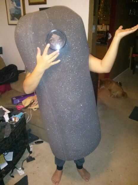 Simple como eso. Probar ajuste. En este momento supe que el traje era demasiado para mi cuerpo corto. lol. Tuve que cortar por lo golpearía mi muslo mediado. He comprado una linterna grande del almacén del dólar y de pensamiento que trabaja para los anteojos, pero como podrás ver fue a pequeño.