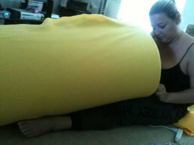 Después de hecho el ajuste funcionó para mí que dibujó la boca en total, los dientes y la lengua. Quería "Whaaaaat?" mire y no soy un artista. Pero hice mi mejor esfuerzo para esbozarlo y estaba bastante contento con los resultados. Usé un cuchillo muy afilado exacto para hacer que todos mis recortes. Corte los dientes y la lengua primero y luego se retira el exceso. Entonces necesitaba a una tela un poco elástica y suave. Encontré un paño amarillo brillante a la venta, comprada el dril de algodón elástico, el velcro, los botones y la plata rivit buscando botones. I total que pasé $20,00 en la tienda de la tela. A continuación pegué caliente del paño grueso y suave para el embalaje de espuma en el agujero de ojo y boca fijándolos con pegamento caliente más.