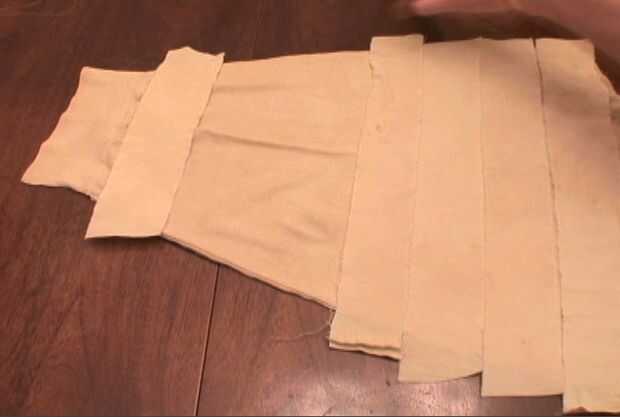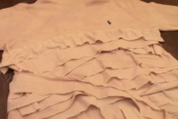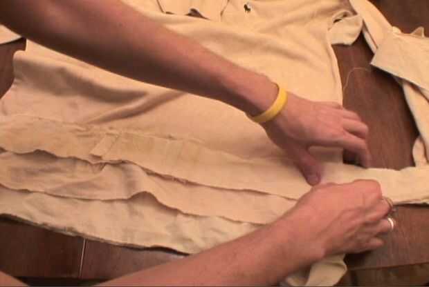 Después de terminar las mangas, coser las tiras a las restantes partes en blanco de la camisa, vuelta del revés y coser sus mangas hacia atrás.