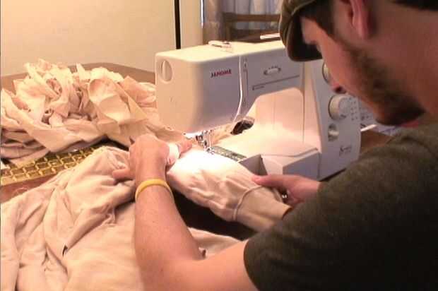 Poner las mangas abajo plana, cortar algunas piezas de material hacia fuera las mangas y coser en.