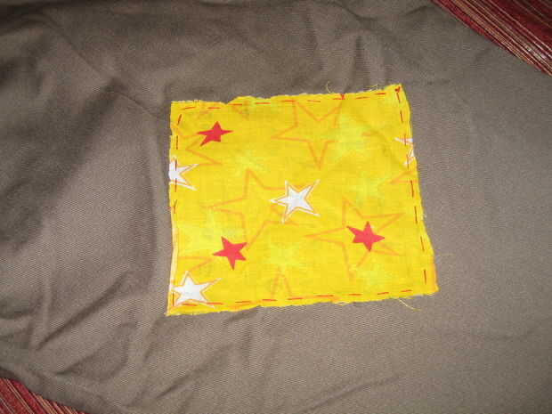 * Opcional: Una vez que el parche está firme y en su lugar, coge tu aguja e hilo. El color de hilo que utilizas es de importante aquí. Tratar de conseguir un color de hilo que no se fusionan con el color de la tela. Comenzar a hacer una puntada floja alrededor de la frontera de su nuevo parche. No hay que ser fuerte, como la costura para las miradas; la puntada líquida que pones en la parte inferior del parche mantenga a su traje bien. La belleza de este paso es que no necesitas saber coser! Puede parecer tan descuidado como usted quiere, porque... bueno... eres un vagabundo! ¿Qué importa?!
