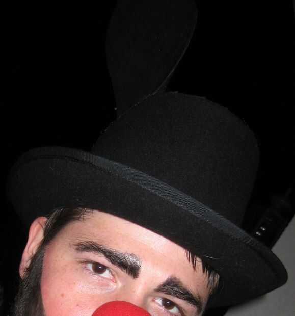 En mi opinión, el sombrero va en la mano con la nariz maquillaje y payaso en cuanto a definir el traje.