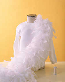 5. Envuelva las boas alrededor del cuerpo con tachuelas o caliente pegado cada par de pulgadas, trabajando alrededor de los brazos hasta que el cuerpo entero está cubierto hasta el dobladillo de la camiseta donde usted cosido antes. Usted debería haber utilizado hasta 4 boas en este punto.